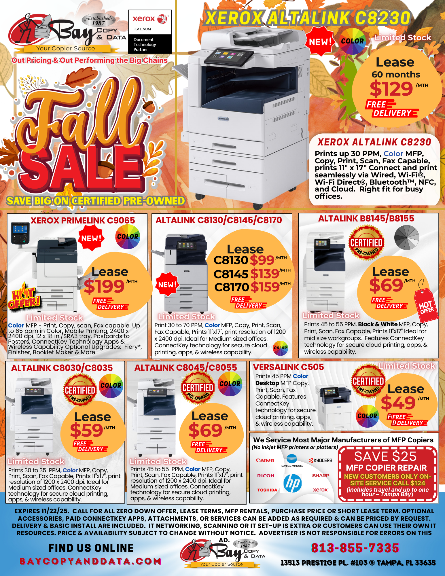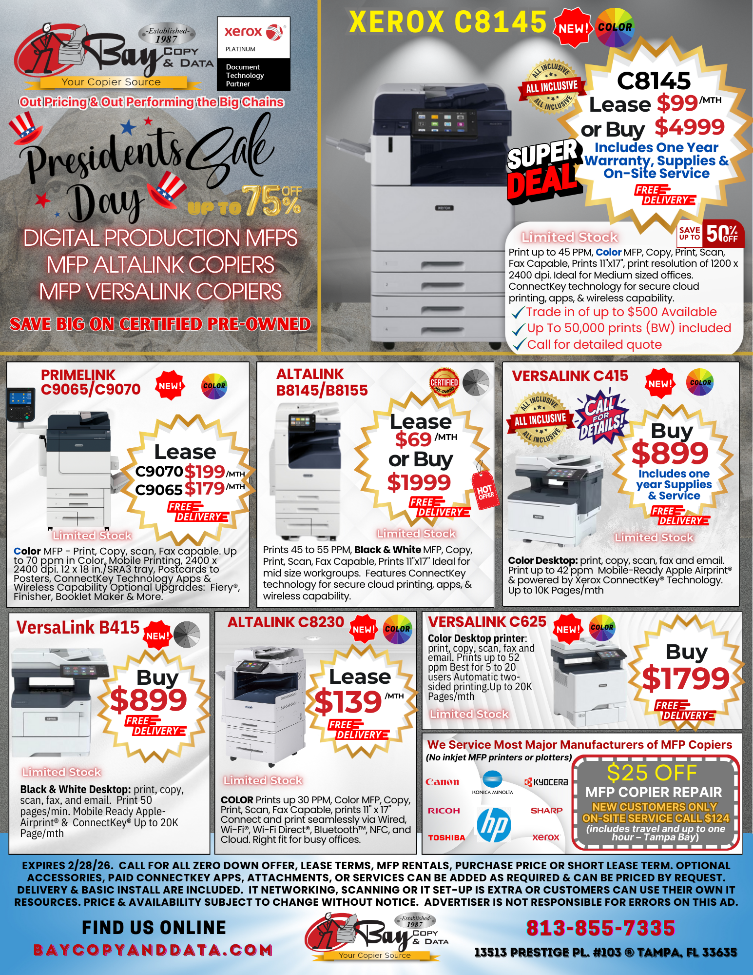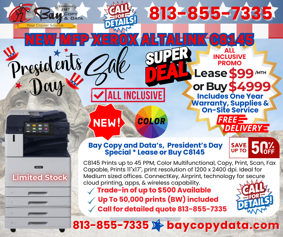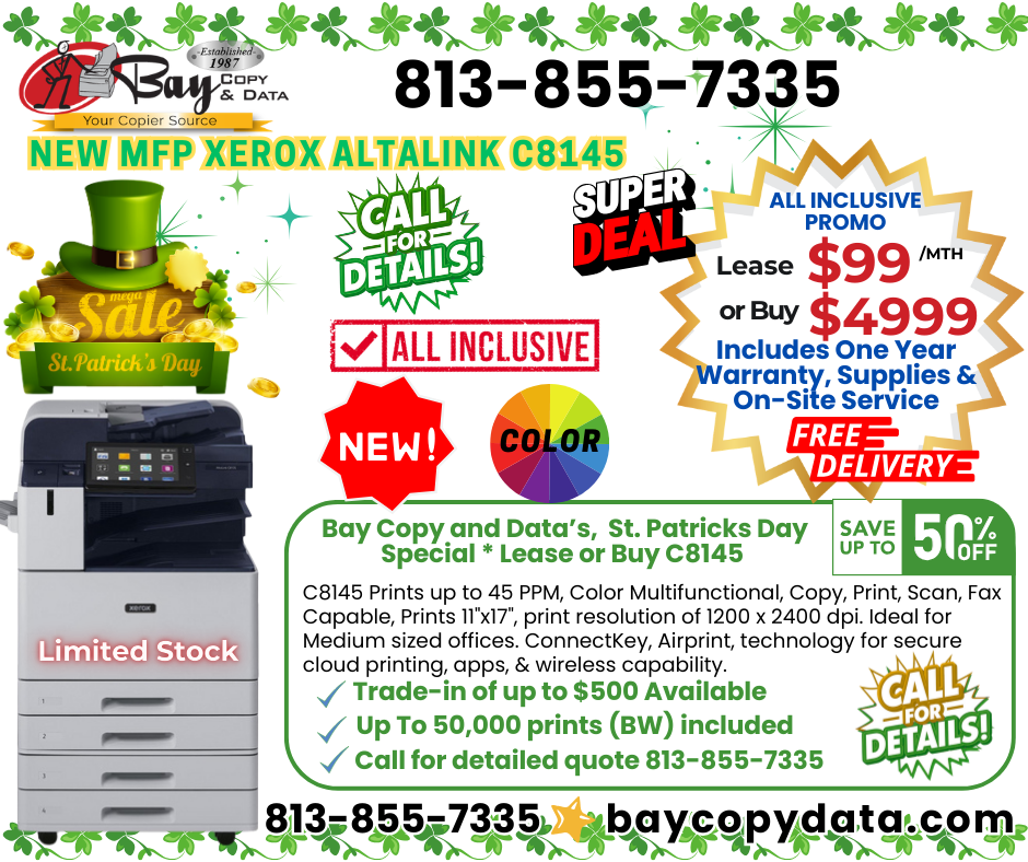 ☘️ Your Office Just Got Lucky: The 2026 St. Patrick’s Day Xerox Special! Stop searching for a four-leaf clover and start saving "green" with Bay Copy and Data’s exclusive March promotion! For a limited time, businesses in Tampa, Clearwater, Lakeland, and St. Pete can secure the powerhouse Xerox AltaLink C8145 Color MFP with special 2026 holiday leasing rates and purchase incentives. Featuring AI-driven security, lightning-fast 45 PPM output, and our industry-leading 5-hour local service guarantee, this deal is the "pot of gold" your workflow deserves. Don't let your productivity rely on luck—upgrade to the gold standard of office technology today!